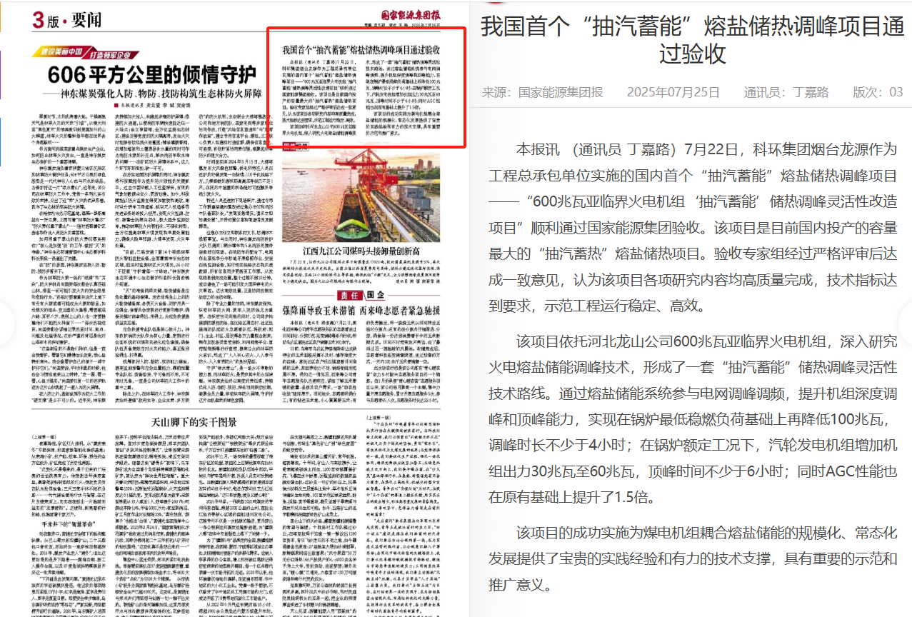 7月22日,科環集團煙臺龍源作為工程總承包單位實施的國內首個“抽汽蓄能”熔鹽儲熱調峰項目“600兆瓦亞臨界火電機組'抽汽蓄能’儲熱調...