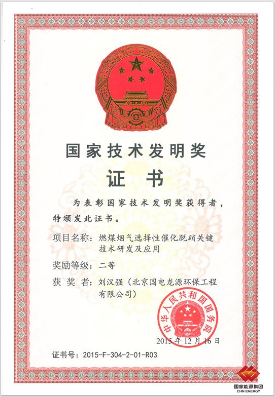 龍源環保榮獲2015年國家技術發明獎二等獎證書